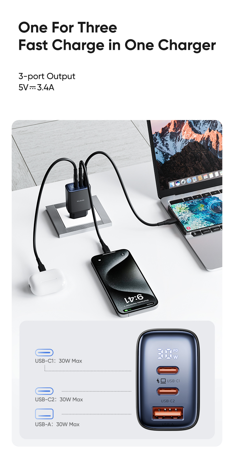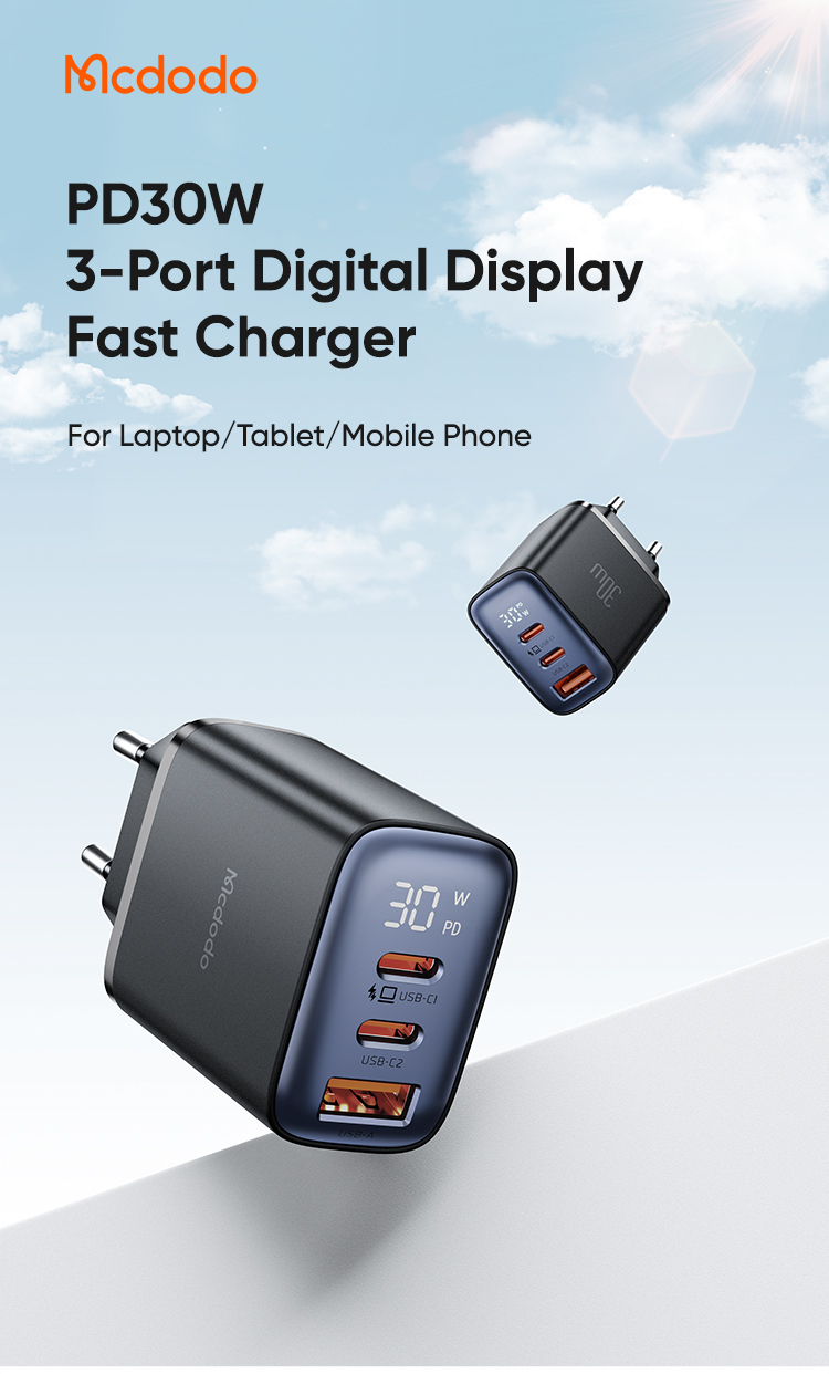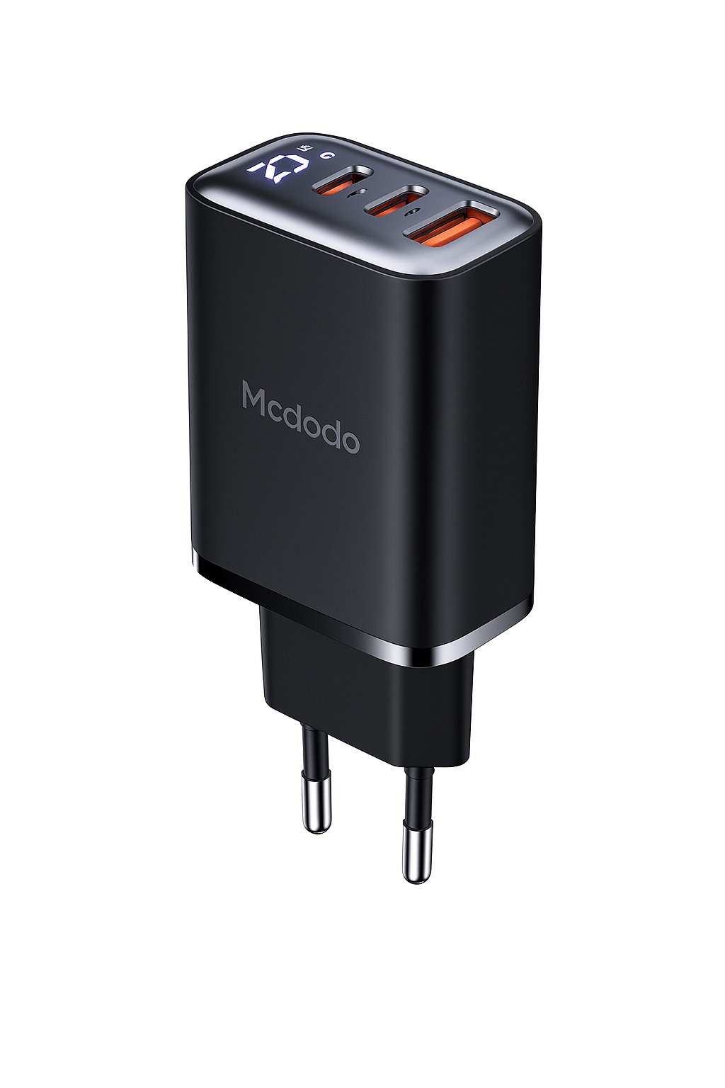 Das Mcdodo Ladegerät CH-2180 kombiniert Leistung, Sicherheit und Design in einem kompakten Format. Mit zwei USB-C- und einem USB-A-Port sowie einer Gesamtleistung von 30W ermöglicht es das gleichzeitige Aufladen mehrerer Geräte. Das digitale Display zeigt in Echtzeit die aktuelle Ladeleistung an.