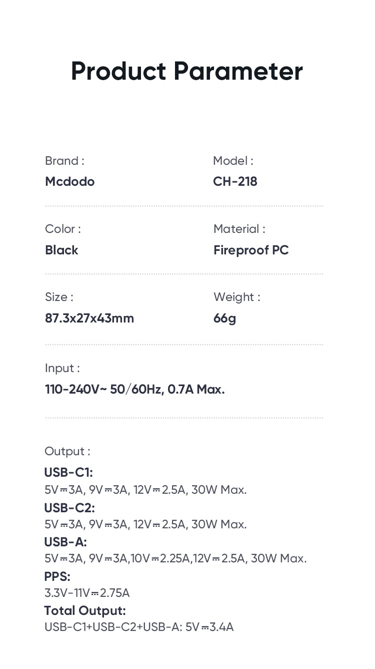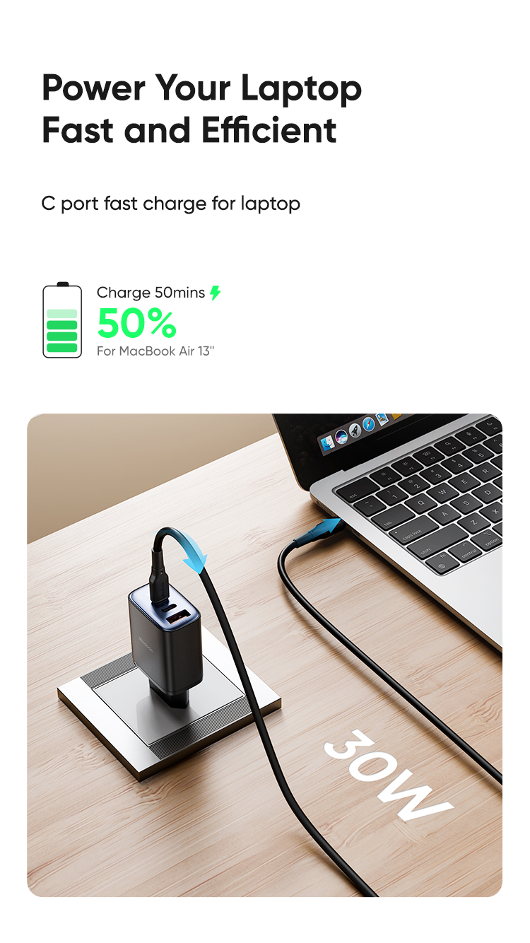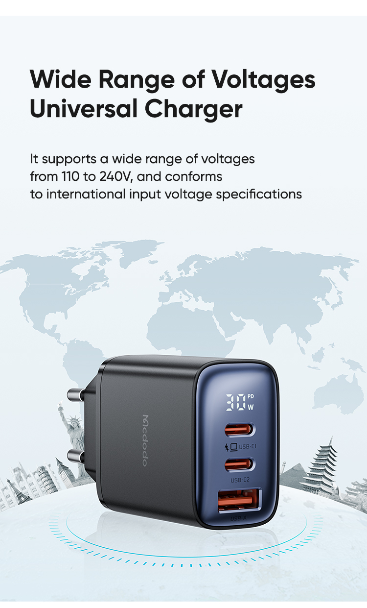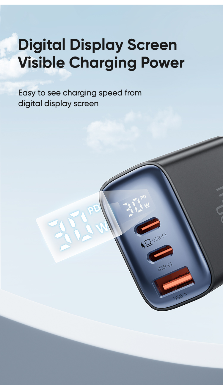Das Mcdodo Ladegerät CH-2180 kombiniert Leistung, Sicherheit und Design in einem kompakten Format. Mit zwei USB-C- und einem USB-A-Port sowie einer Gesamtleistung von 30W ermöglicht es das gleichzeitige Aufladen mehrerer Geräte. Das digitale Display zeigt in Echtzeit die aktuelle Ladeleistung an.