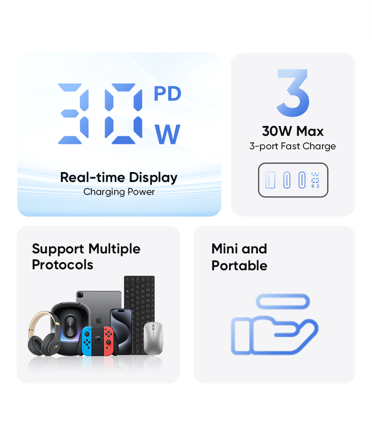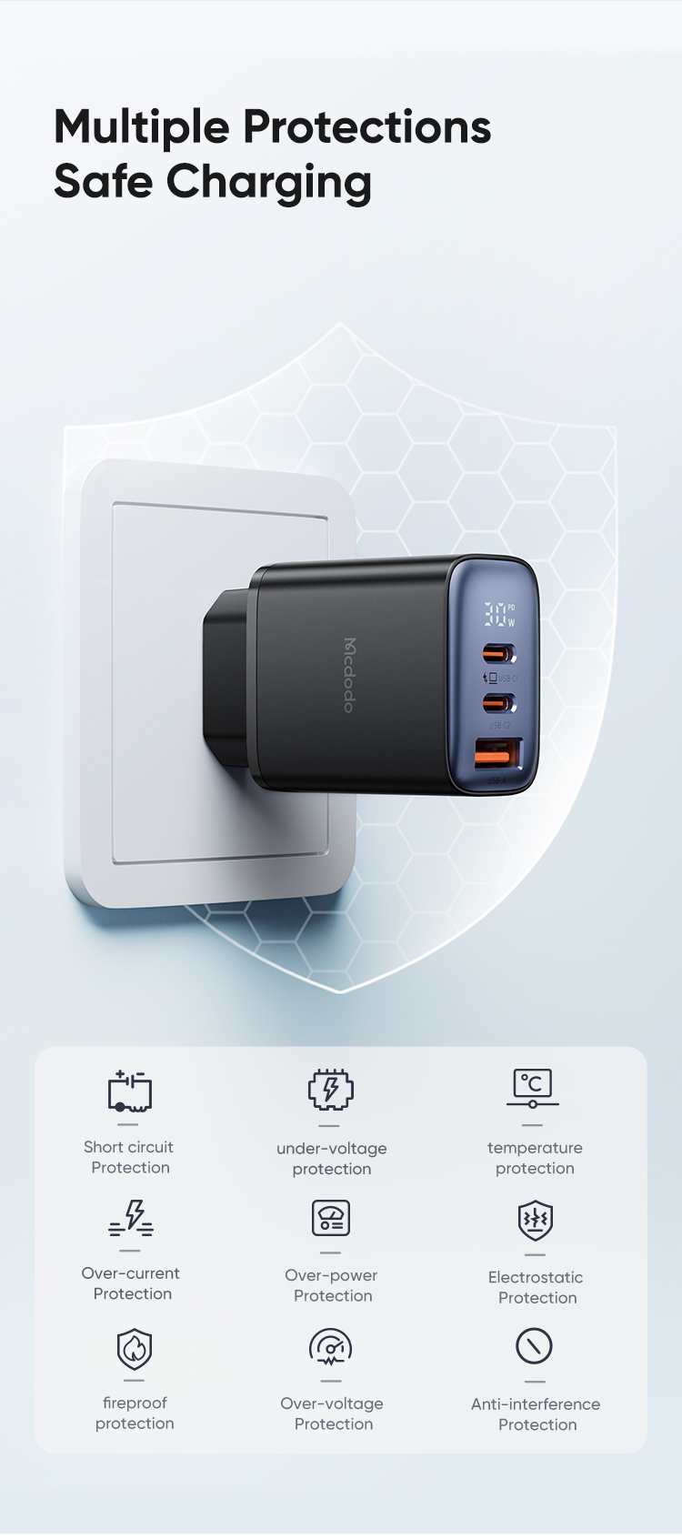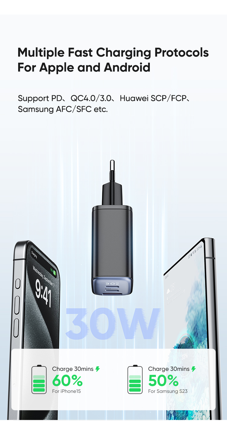 Mehrere Schutzfunktionen wie Überstromschutz, Überspannungsschutz, Kurzschlussschutz, Brandschutzgehäuse und mehr sorgen für eine sichere Nutzung im Alltag. In nur 30 Minuten erreicht ein iPhone 15 etwa 60 % Ladezustand, ein Samsung S23 ca. 50 %.