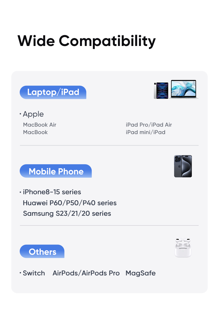 Dank Unterstützung von Schnellladeprotokollen wie PD, QC3.0/4.0, Huawei SCP/FCP sowie Samsung AFC/SFC eignet sich das Ladegerät für zahlreiche Geräte wie iPhone 8–15, Samsung S20–S23, Huawei P40–P60 sowie MacBook Air und iPads.
