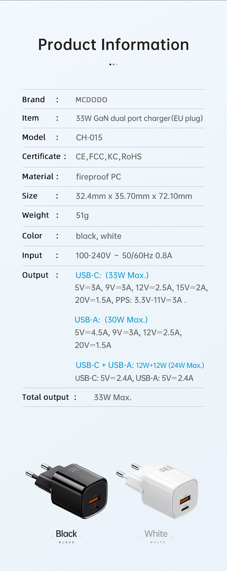 Das Mcdodo CH-0151 ist ein kompaktes, leichtes und dennoch extrem leistungsfähiges 33W GaN-Schnellladegerät mit zwei Ausgängen (USB-C und USB-A), das gleichzeitig zwei Geräte schnell und sicher aufladen kann. Dank moderner GaN-Technologie (Galliumnitrid) arbeitet es mit geringerer Wärmeentwicklung, höherer Effizienz und ist besonders langlebig.