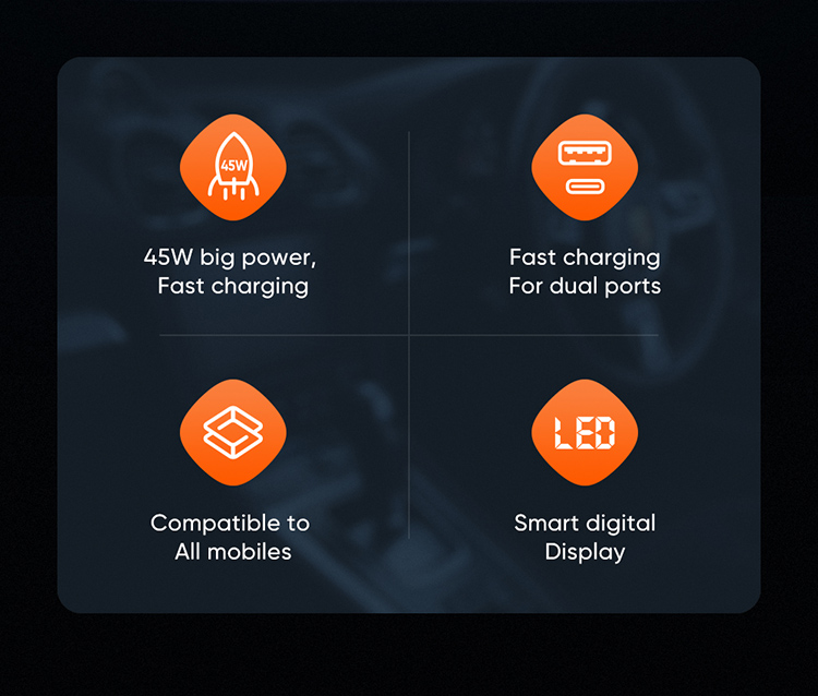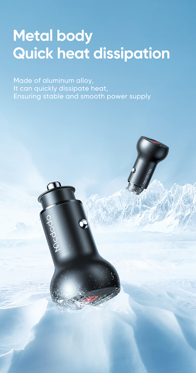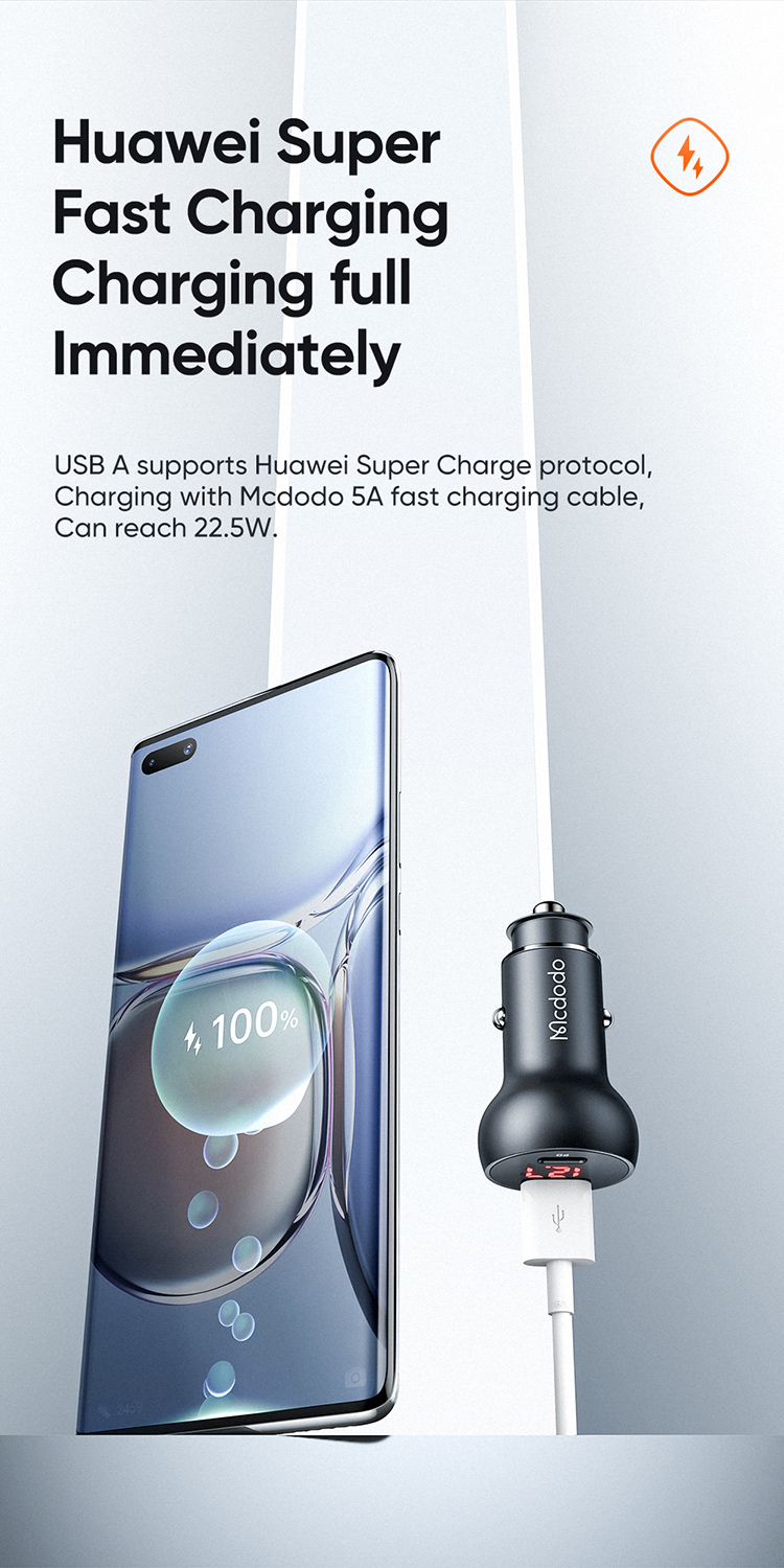 The Mcdodo CC-7030 dual port car charger is a high-performance, safe charging solution for on-the-go power needs. With a total output of 45W, it supports fast charging via PD3.0 and Huawei SCP protocols, delivering up to 30% battery in just 15 minutes on compatible devices.