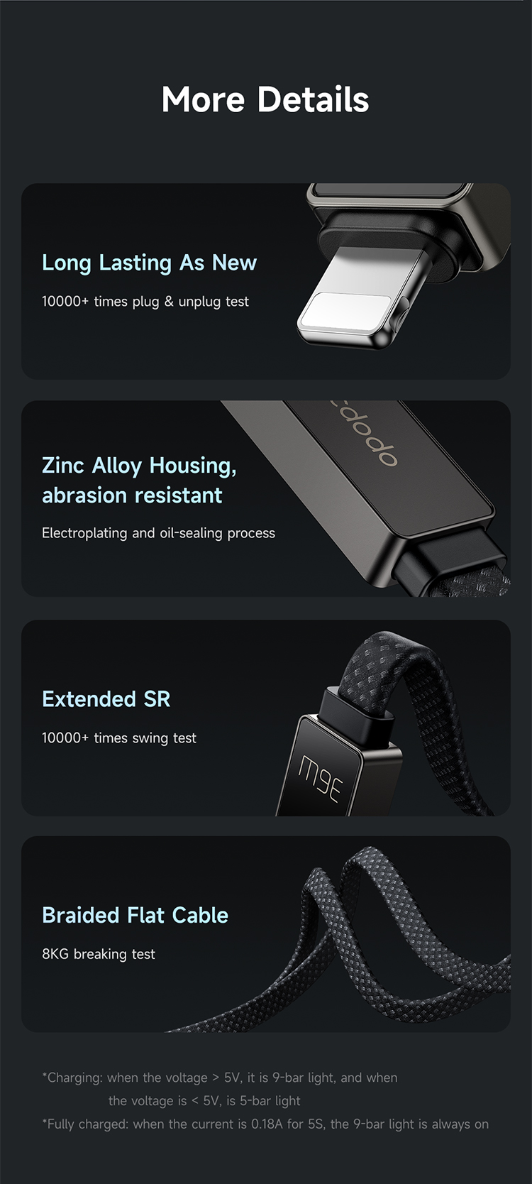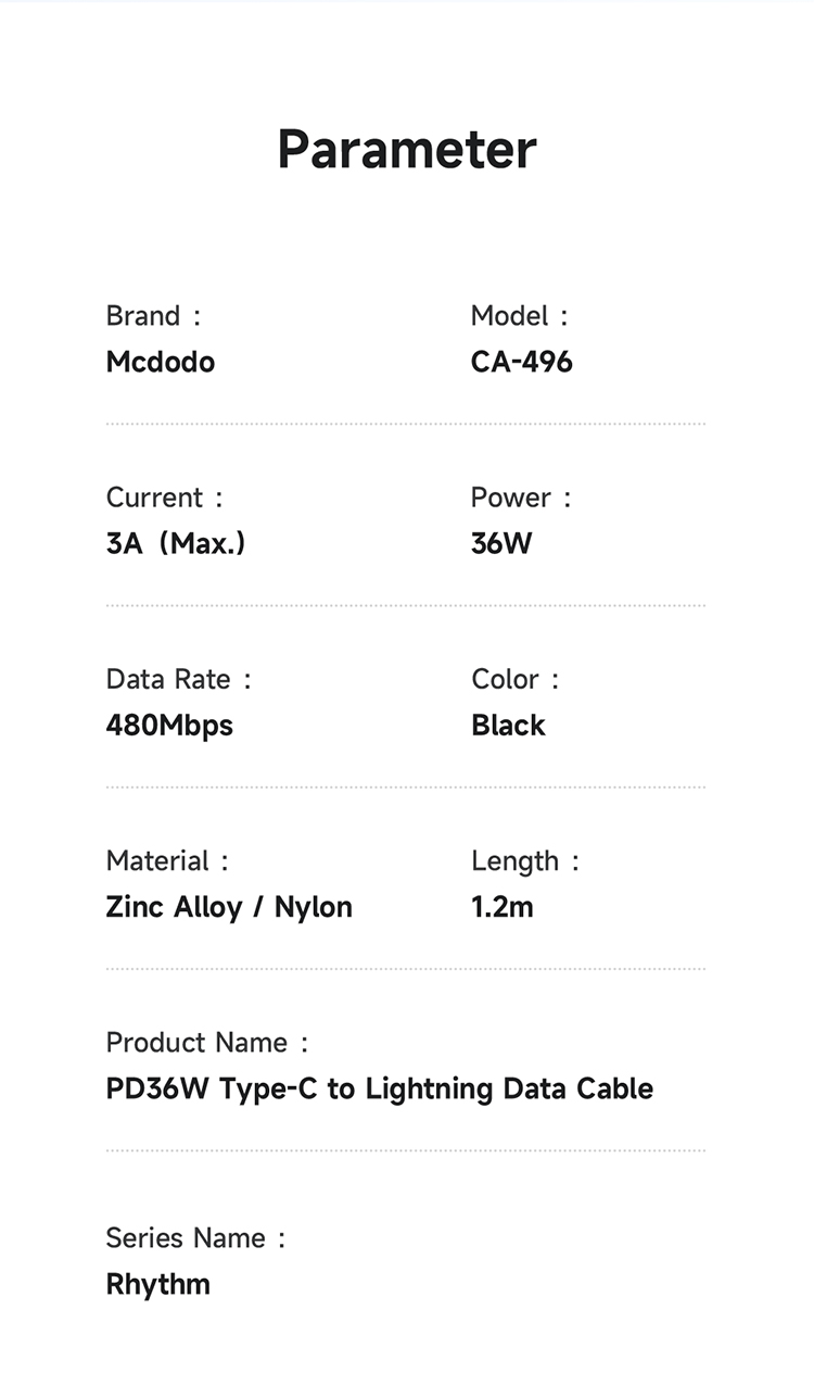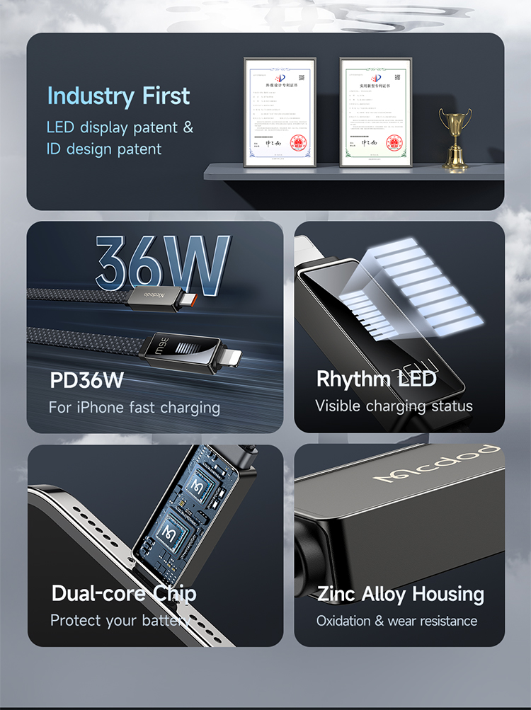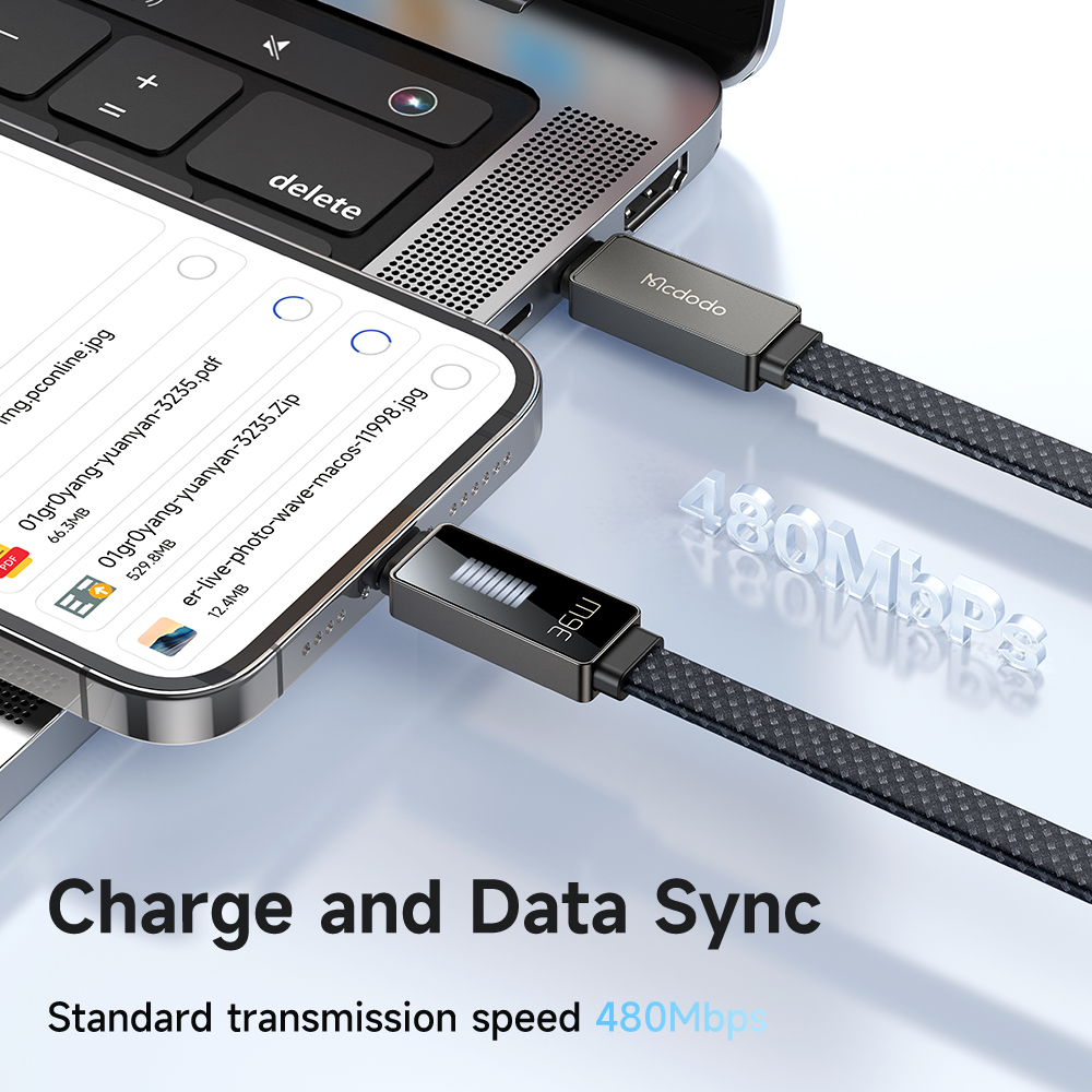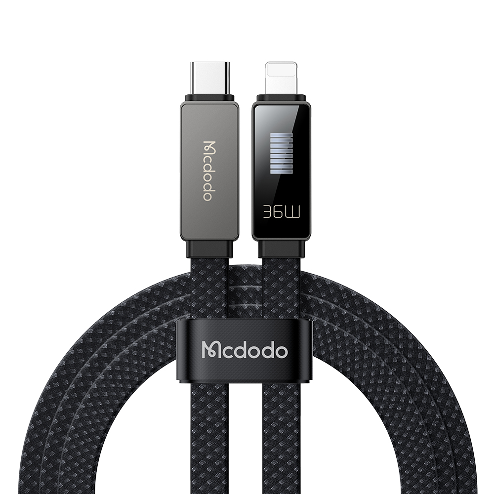 The Mcdodo CA-4960 is a premium USB-C to Lightning data cable featuring 36W Power Delivery, optimized for fast charging iPhones and iPads. It includes a 1.2-meter flat braided cable made of zinc alloy and nylon, along with a clear rhythm-style LED display showing real-time charging status. A dual-core chip inside ensures both high-speed charging and safe operation by controlling heat levels. Ideal for Apple device users seeking efficiency and safety.