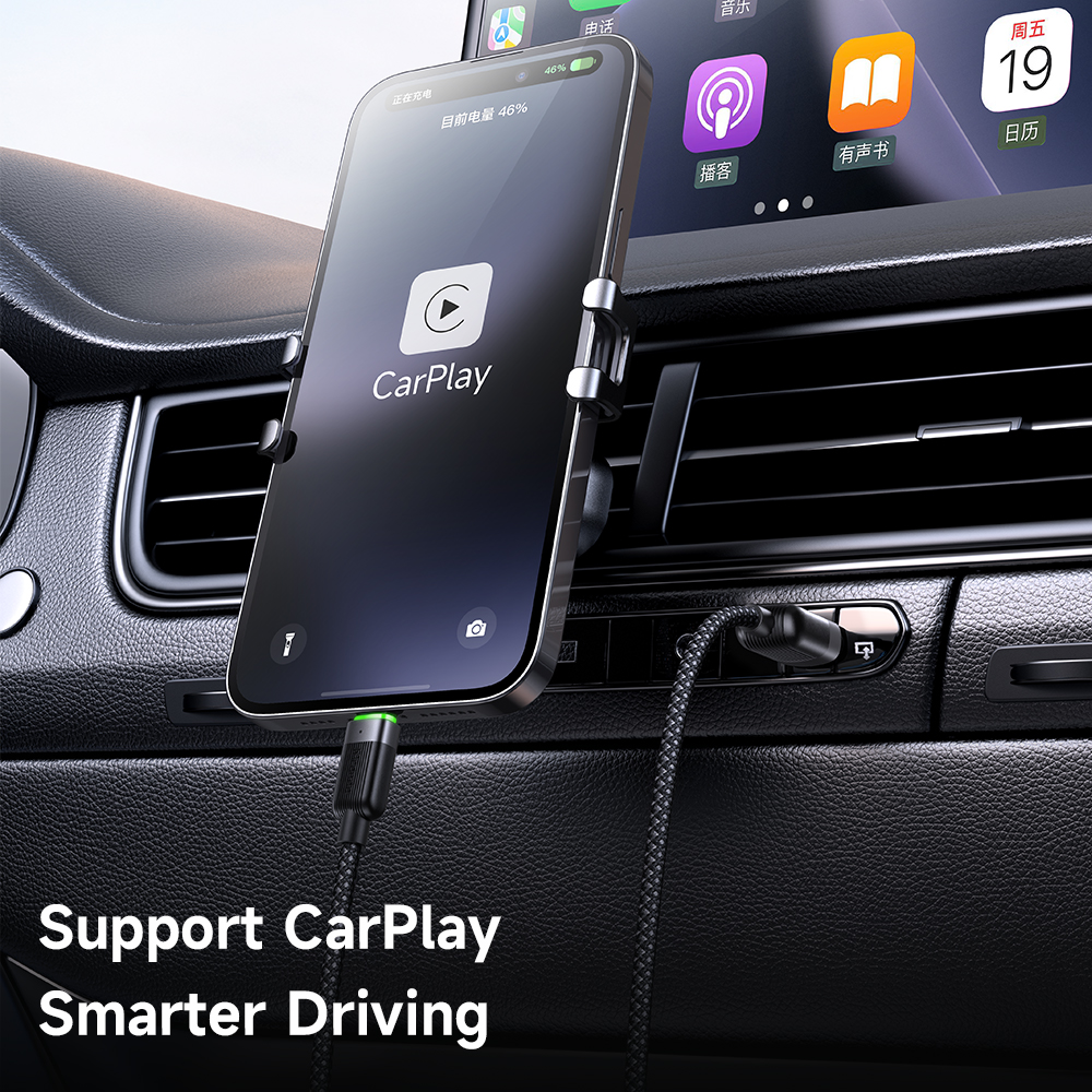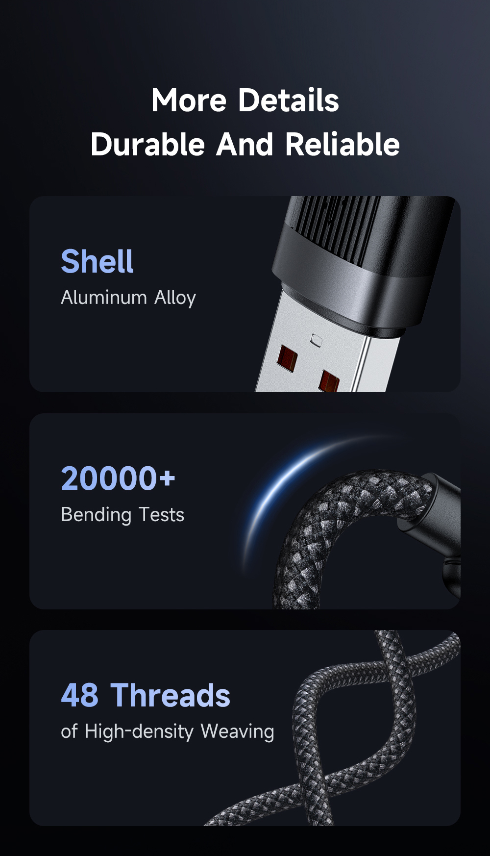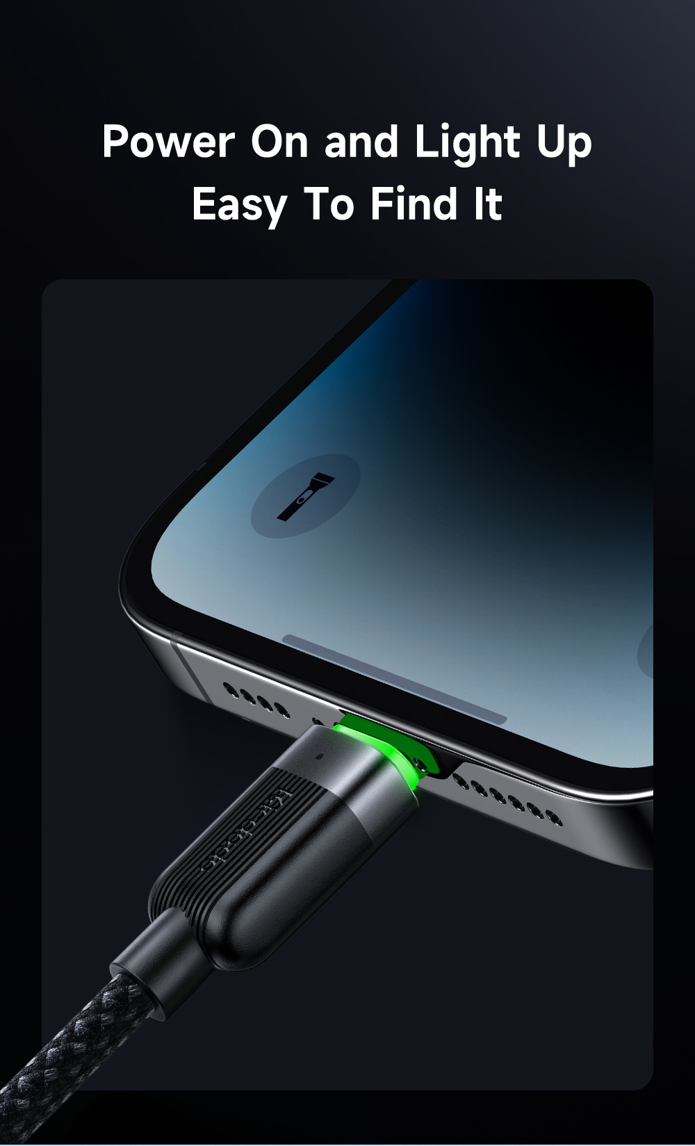 Mit einem eleganten schwarzen Design und grünem LED-Ladeanzeige zeigt das Kabel den Ladestatus deutlich an. Die Aluminiumhülle und das geflochtene Nylon sorgen für Langlebigkeit und hohe Biegefestigkeit (20.000+ Tests). Mit einer Stromstärke von 3A unterstützt es schnelles Laden und gleichzeitige Datenübertragung mit bis zu 480Mbps.