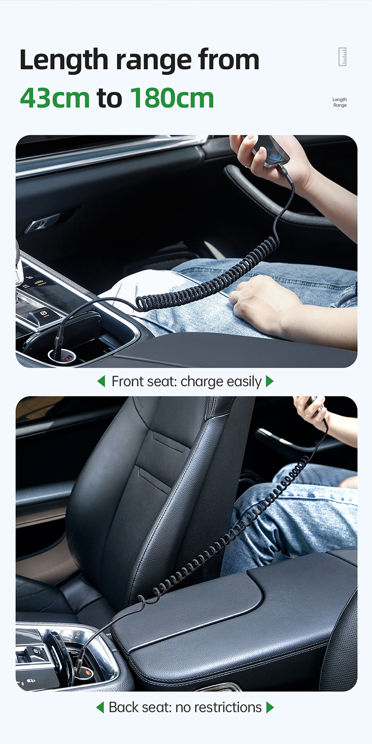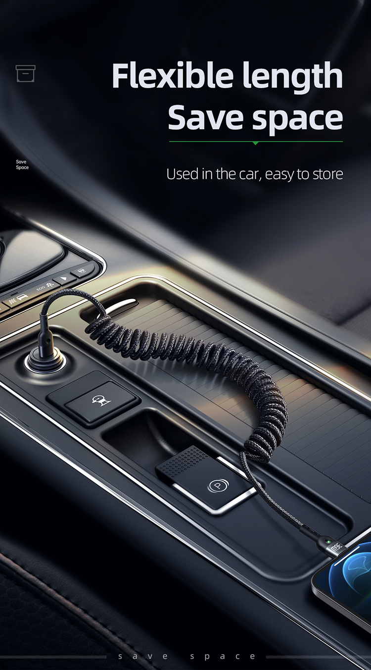 Das spiralförmige Design ist platzsparend, flexibel und lässt sich auf bis zu 1,8 m ausziehen – perfekt für die Nutzung im Auto. Das robuste Kabel besteht aus einem Aluminiumlegierungsgehäuse mit strapazierfähiger, geflochtener Nylonummantelung, die gegen Ziehen, Knicken und Verdrehen resistent ist.