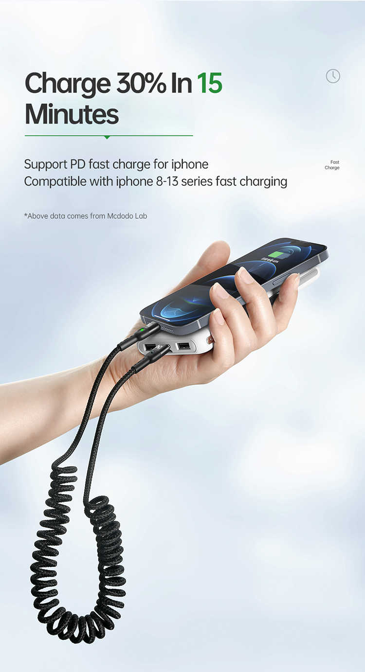 Das Mcdodo CA-1960 ist ein hochwertiges USB-C auf Lightning Spiralkabel, das speziell für Apple-Geräte entwickelt wurde. Mit einer Leistung von bis zu 60W unterstützt es PD 3.0 und QC Schnellladung und lädt ein iPhone in nur 15 Minuten auf 30 % auf – ideal für den Alltag und unterwegs.