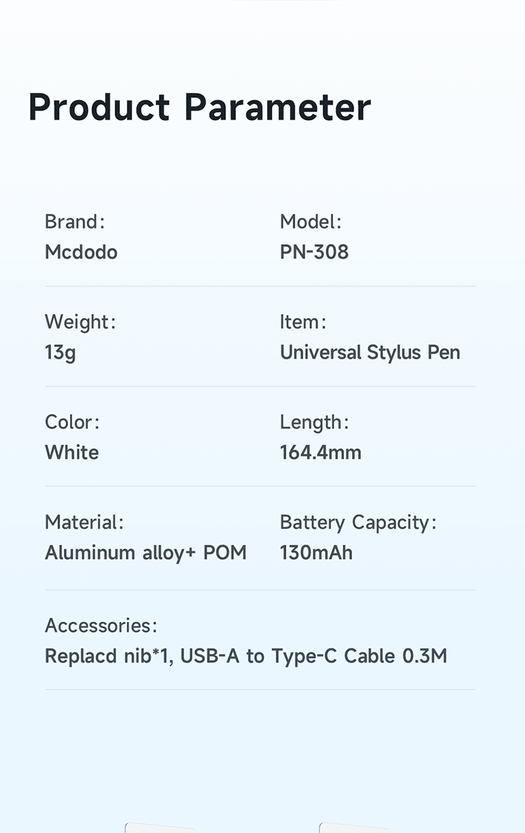 Der Stylus Pen PN-3080 von Mcdodo ist ein leistungsstarkes Werkzeug für Kreative, Studierende und Business-User. Mit nur 13 g Gewicht, einem hochwertigen Aluminiumgehäuse und einer POM-Austauschspitze liegt er angenehm in der Hand und bietet präzise Eingaben.
