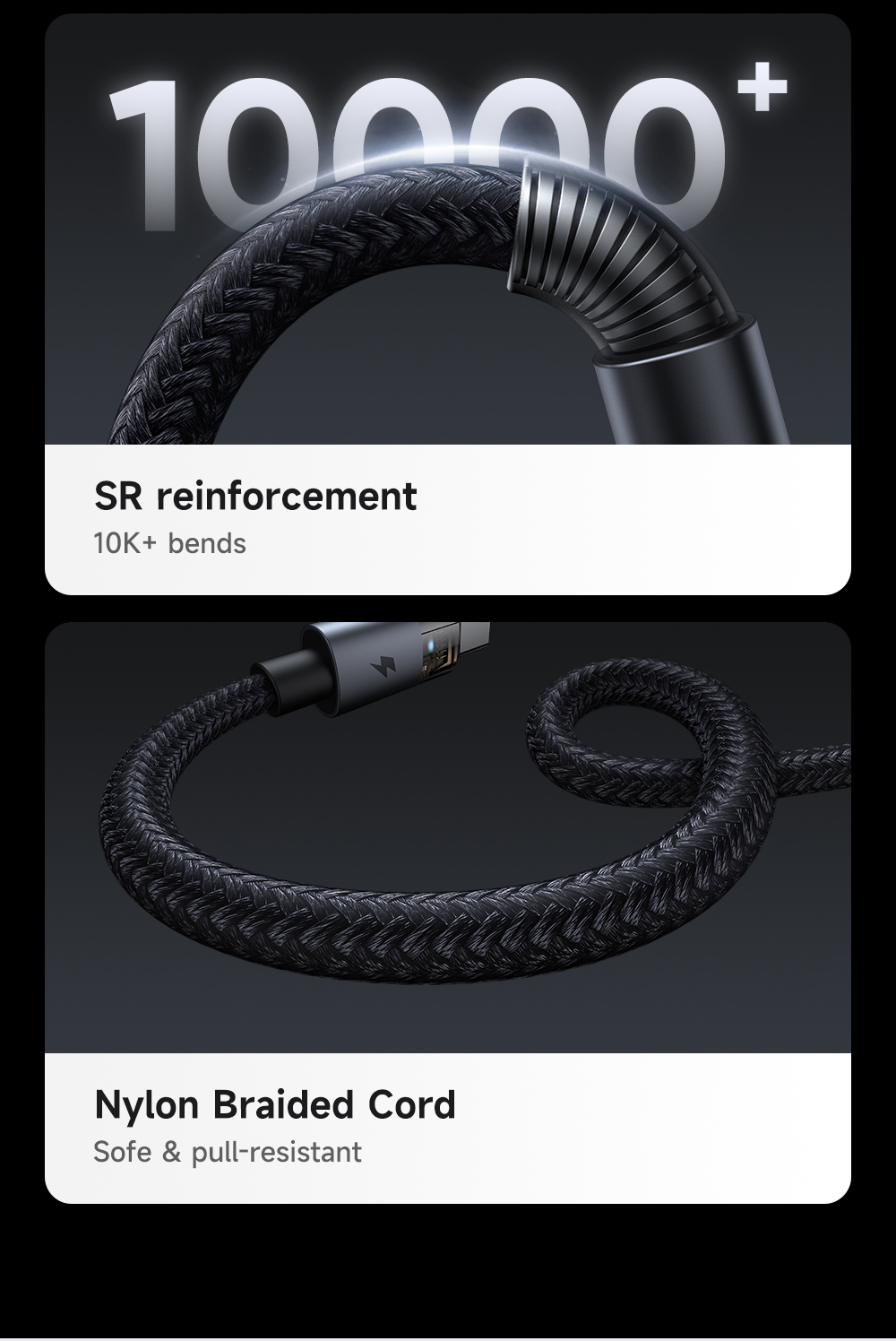 Die Kombination aus Aluminiumlegierung und geflochtenem Nylon macht es besonders langlebig. Es wurde erfolgreich auf über 10.000 Biegungen getestet. Die Aluminiumgehäuse sind rostfrei, hitzebeständig und bieten eine ausgezeichnete Oxidationsbeständigkeit. Zusätzlich ermöglicht das Kabel Datenübertragungen mit bis zu 480 Mbps.