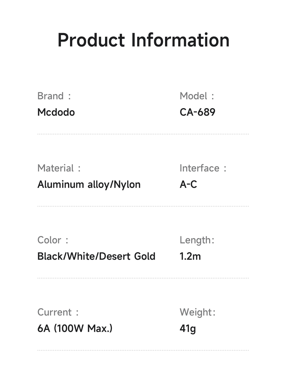 Das CA-689-Kabel ist ein Qualitätsprodukt der renommierten Marke Mcdodo, bekannt für exzellente Verarbeitung, hochwertige Materialien und CE-Zertifizierung.