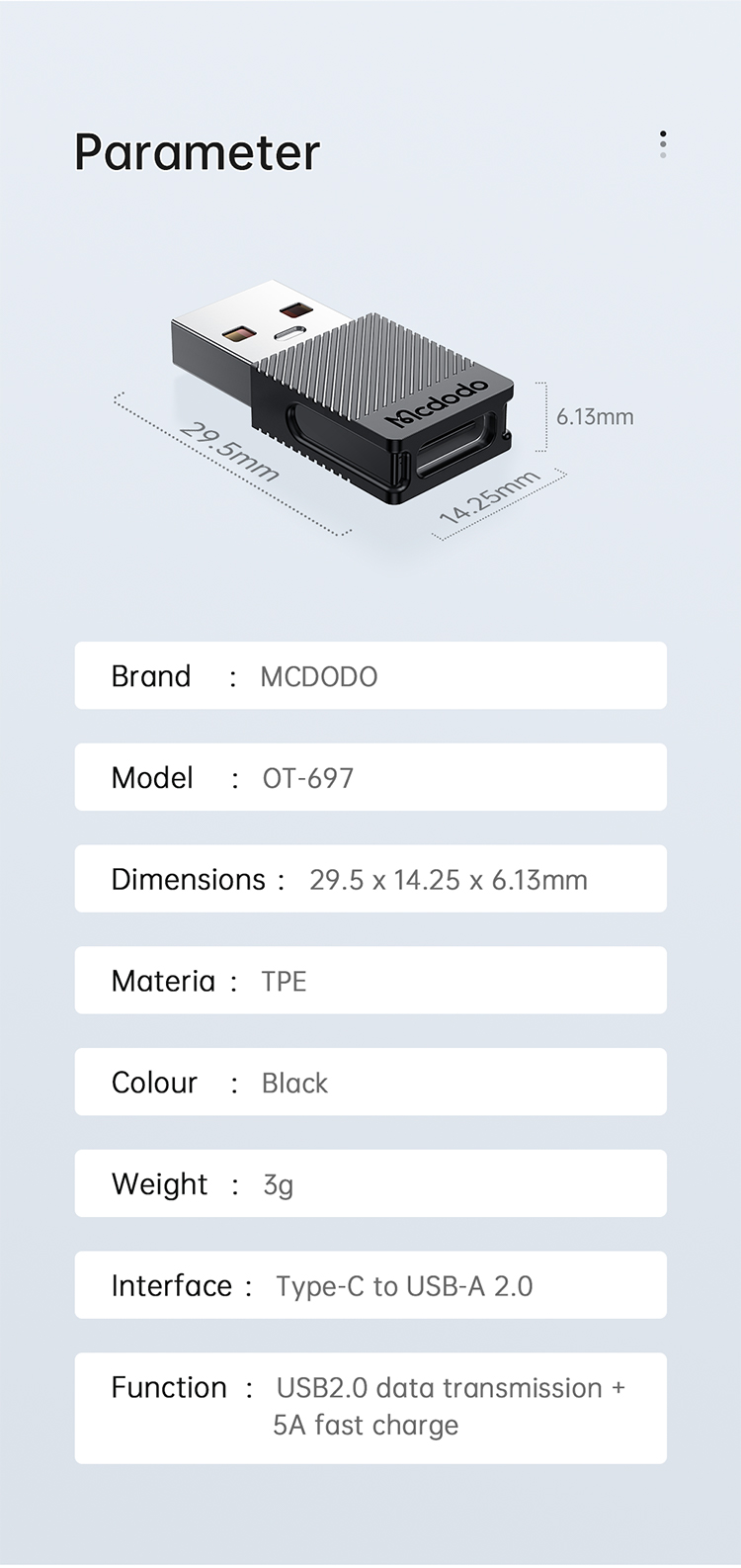 The Mcdodo OT-6970 is a Type-C to USB-A 2.0 convertor, designed for fast data transfer and charging. It enables seamless connection to USB-A devices like flash drives, external hard drives, keyboards, mice, and Type-C earphones.