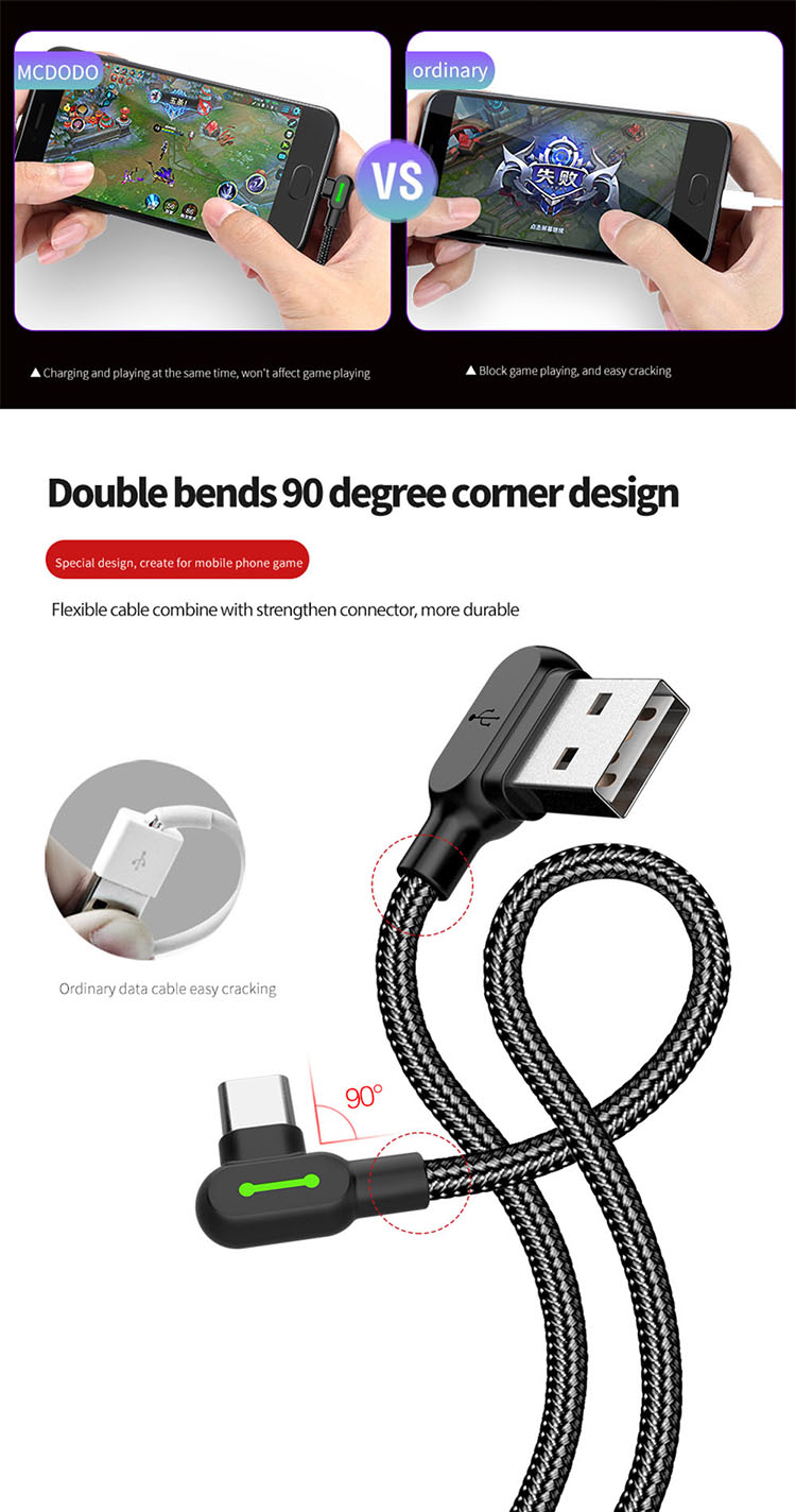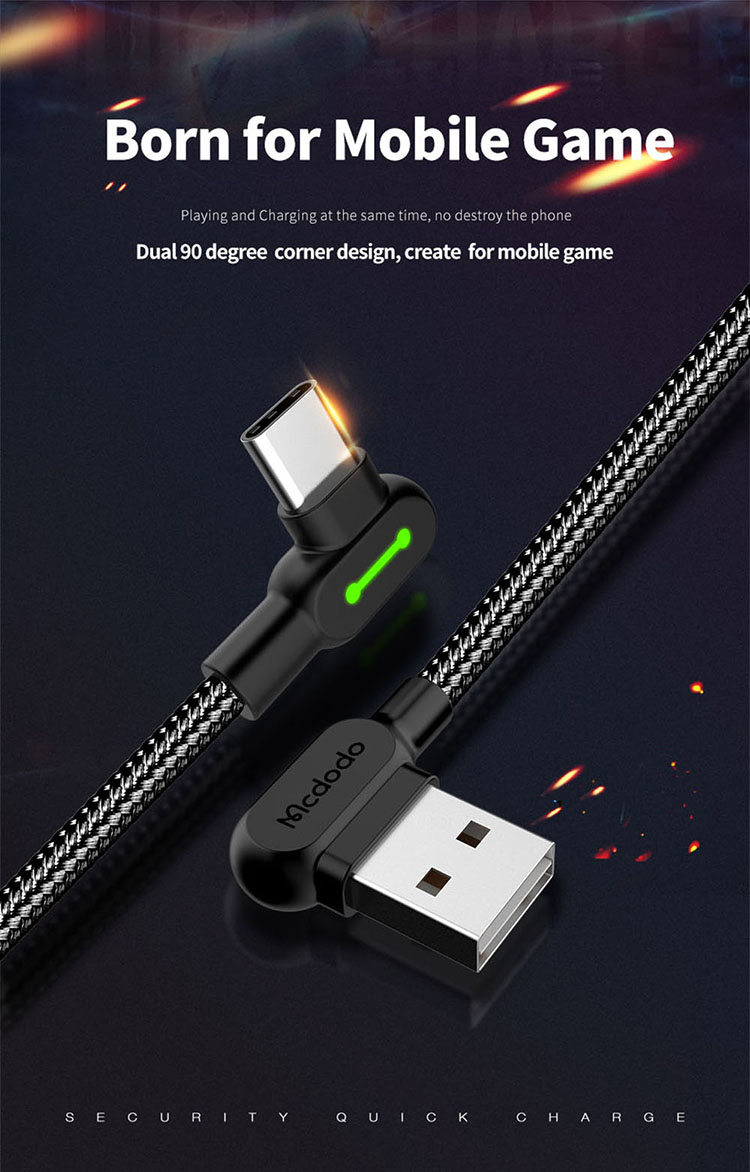 Das Mcdodo CA-5282 USB-A auf USB-C Ladekabel wurde speziell für Gamer und Nutzer entwickelt, die Wert auf Komfort, Haltbarkeit und Effizienz legen. Das besondere 90-Grad-Winkel-Design verhindert das Abknicken des Kabels und ermöglicht eine bequeme Nutzung des Smartphones im Querformat – ideal beim Spielen oder Ansehen von Videos.