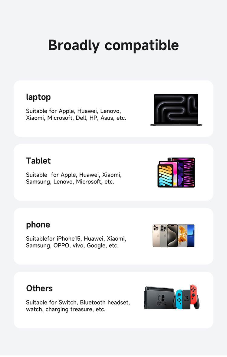 MacBook Pro/Air, iPad Pro, Dell XPS, HP Spectre, Lenovo ThinkPad, Asus Zenbook, Samsung Galaxy S23/S22/S21/S20, Xiaomi Mi 13/12, Huawei Mate/P, Google Pixel, iPhone 15/15 Pro, Nintendo Switch und alle anderen USB-C Geräte