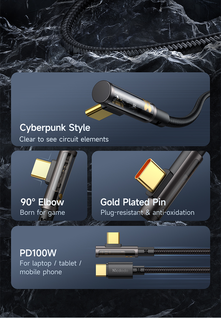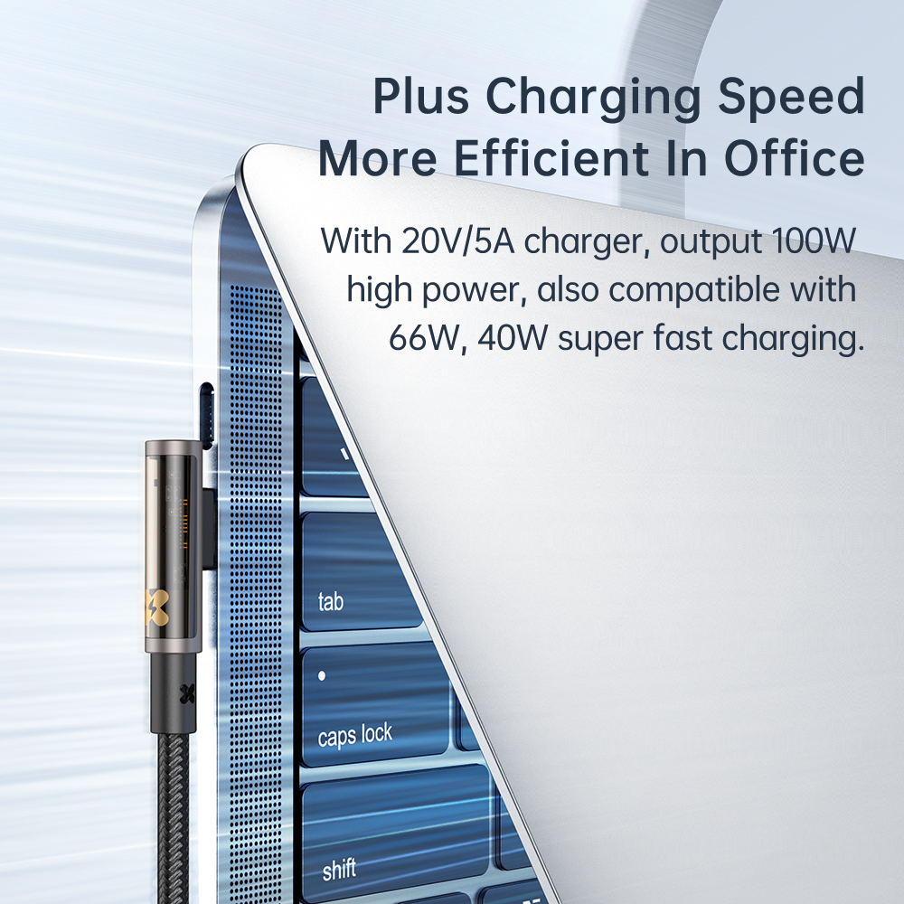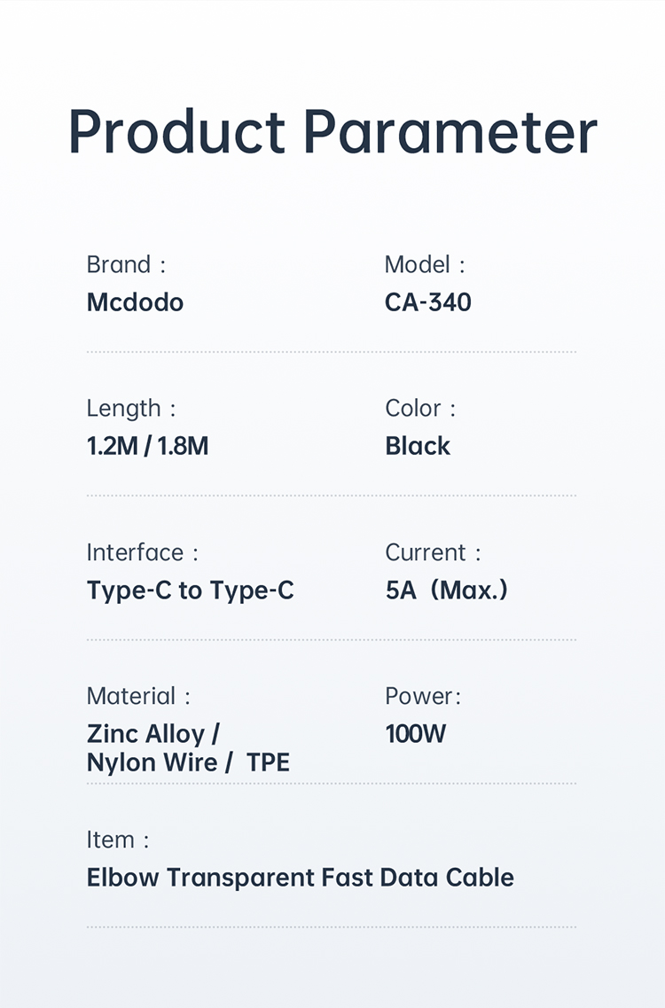 Das Mcdodo CA-3400 USB-C auf USB-C Kabel mit transparentem 90°-Winkelstecker wurde für Nutzer entwickelt, die Wert auf Geschwindigkeit, Langlebigkeit und Design legen. Es unterstützt Power Delivery mit bis zu 100W (20V/5A) und ist ideal zum Schnellladen von MacBooks, Tablets, iPads und Android-Smartphones mit USB-C-Anschluss geeignet.