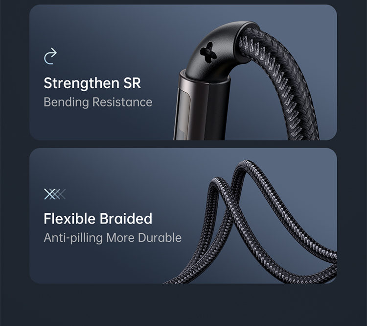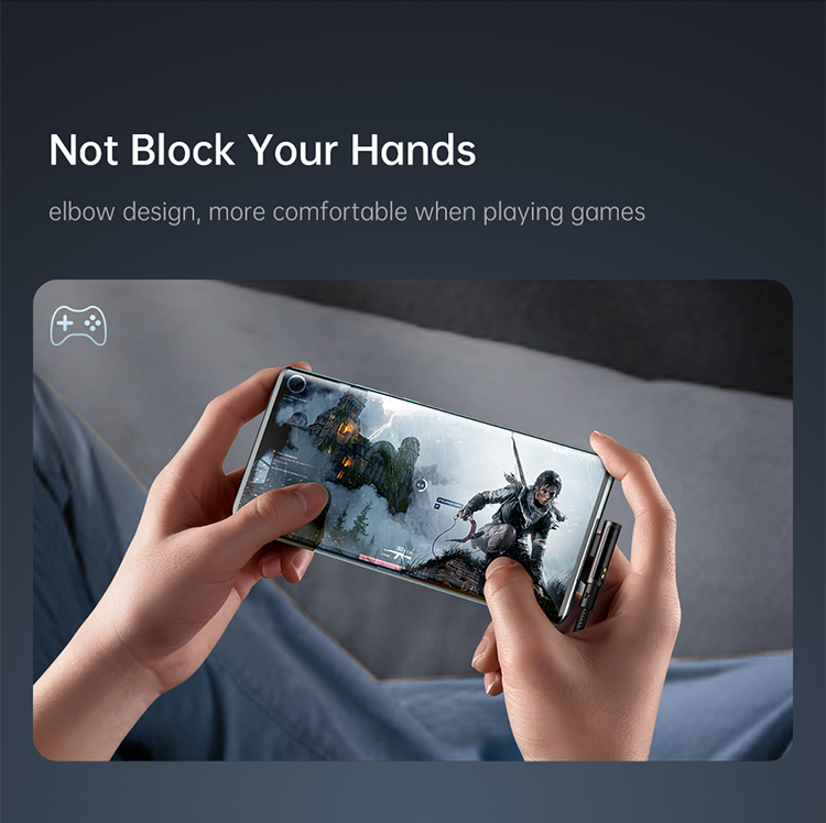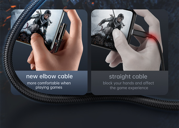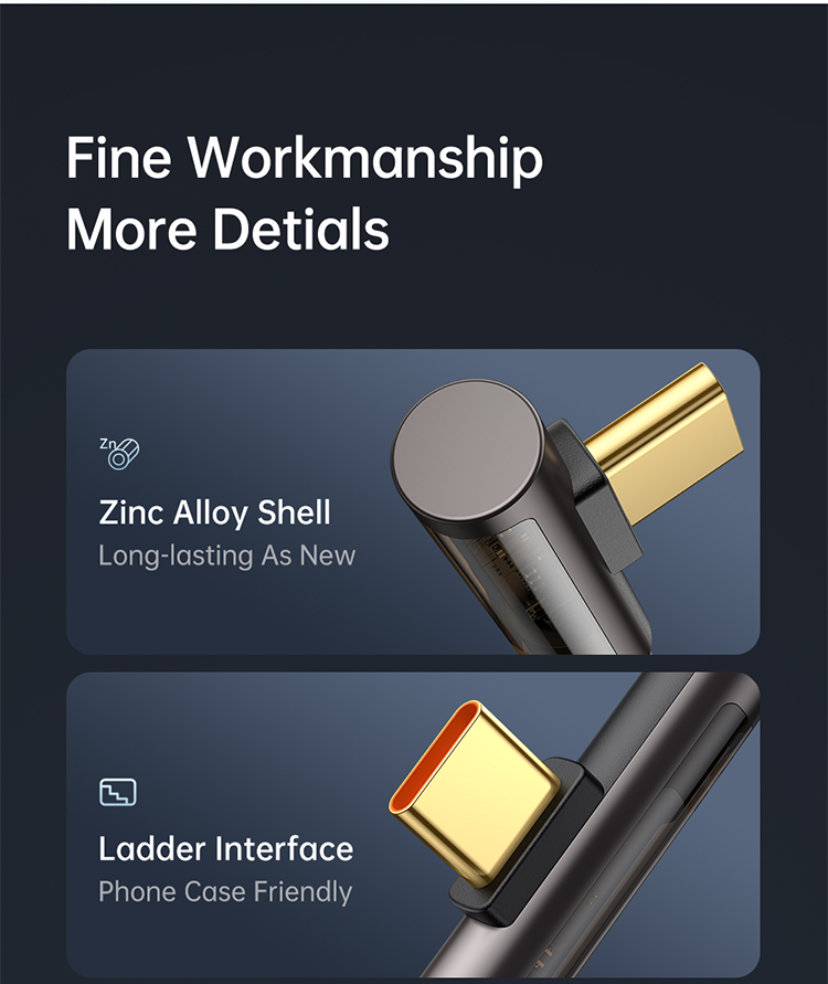 Die äußere Hülle besteht aus einer Kombination aus geflochtenem Nylon, Zinklegierung und TPE, die dem Kabel eine hervorragende Biegefestigkeit und Widerstandsfähigkeit gegen Abnutzung verleiht. Das ergonomische 90°-Design sorgt für mehr Komfort beim Spielen, Arbeiten oder Laden unterwegs.