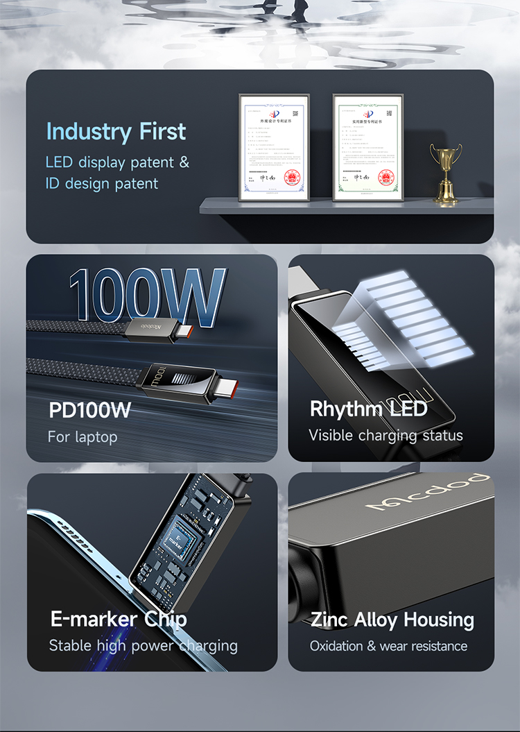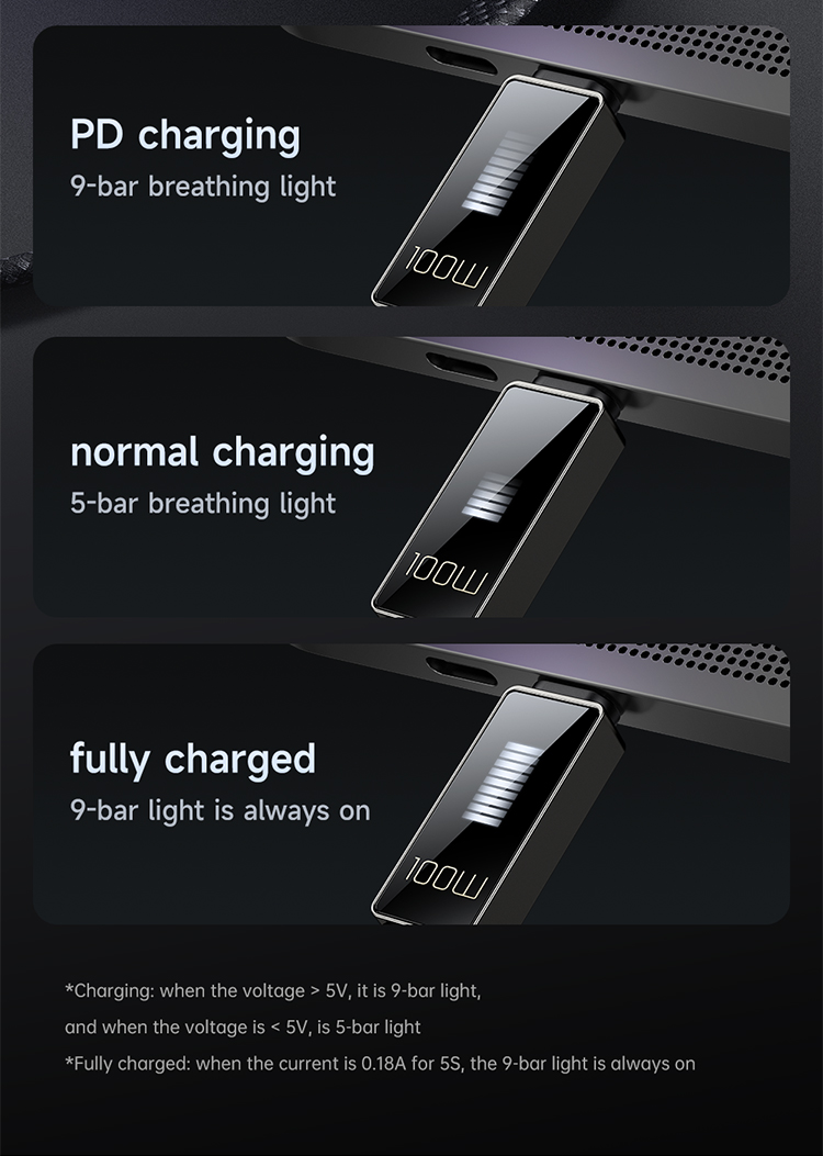 Premium USB-C to USB-C cable with integrated LED rhythm display, ideal for fast charging laptops, tablets, and smartphones up to 100W. Built-in E-Marker chip ensures safe and intelligent power distribution.