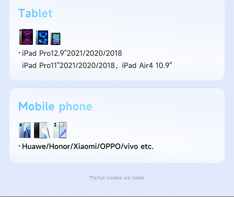 • Tablets: iPad Pro 12.9″ (2021/2020/2018), iPad Pro 11″, iPad Air 10.9″
