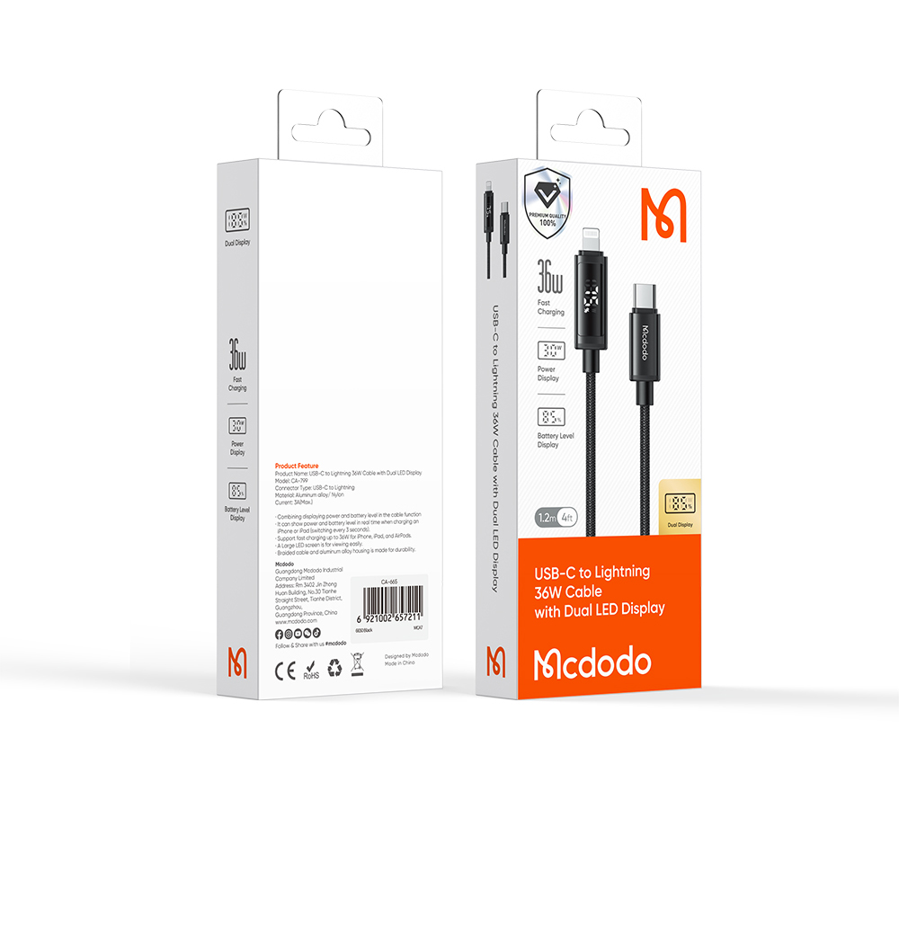 Das USB-C-zu-Lightning Kabel Modell CA-7990 von Mcdodo ist eine intelligente und leistungsstarke Ladelösung, die speziell für Apple-Nutzer entwickelt wurde. Mit einer maximalen Ausgangsleistung von 36W ermöglicht es schnelles und effizientes Aufladen von iPhones, iPads und anderen Geräten mit Lightning-Anschluss.