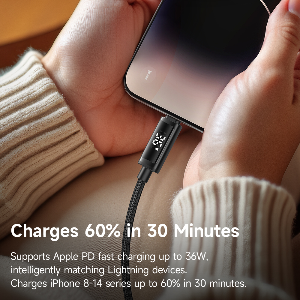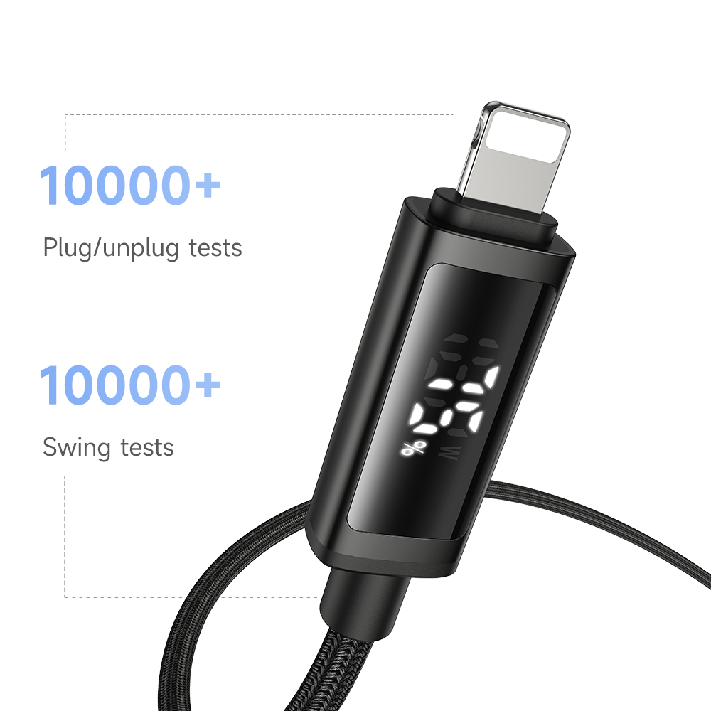 Ein besonderes Highlight dieses Kabels ist das Dual-LED-Display, das automatisch alle 3 Sekunden zwischen der aktuellen Ladeleistung (Watt) und dem Batteriestand (%) wechselt. So behalten Sie den Ladezustand jederzeit im Blick – ganz ohne das Gerät zu entsperren.