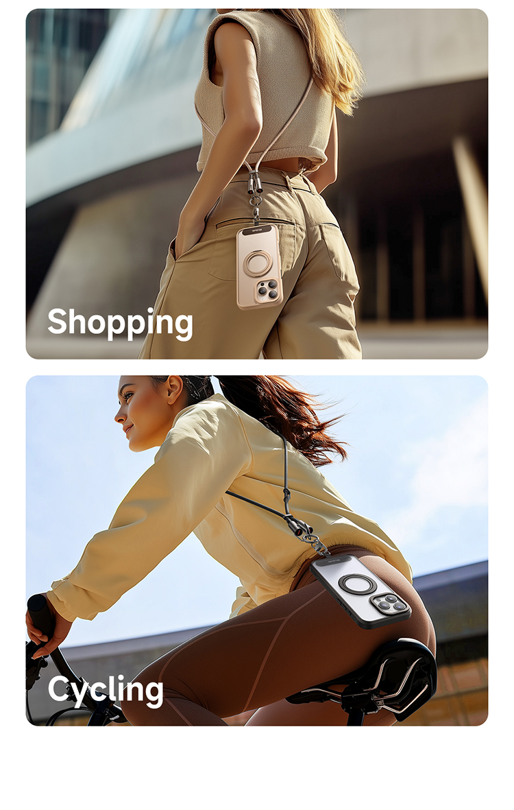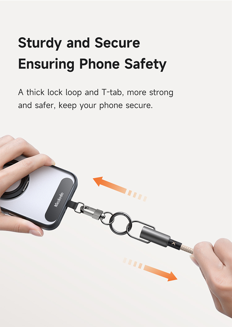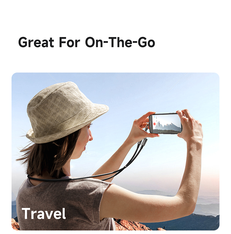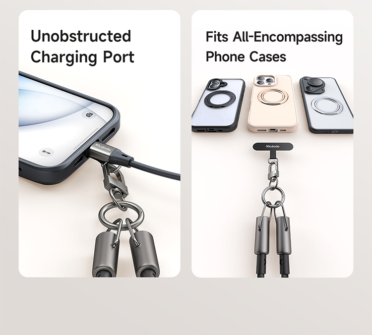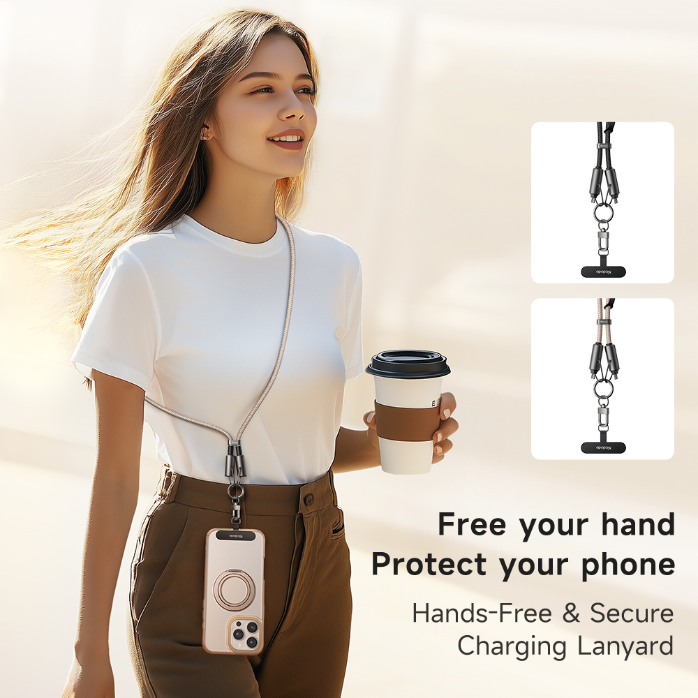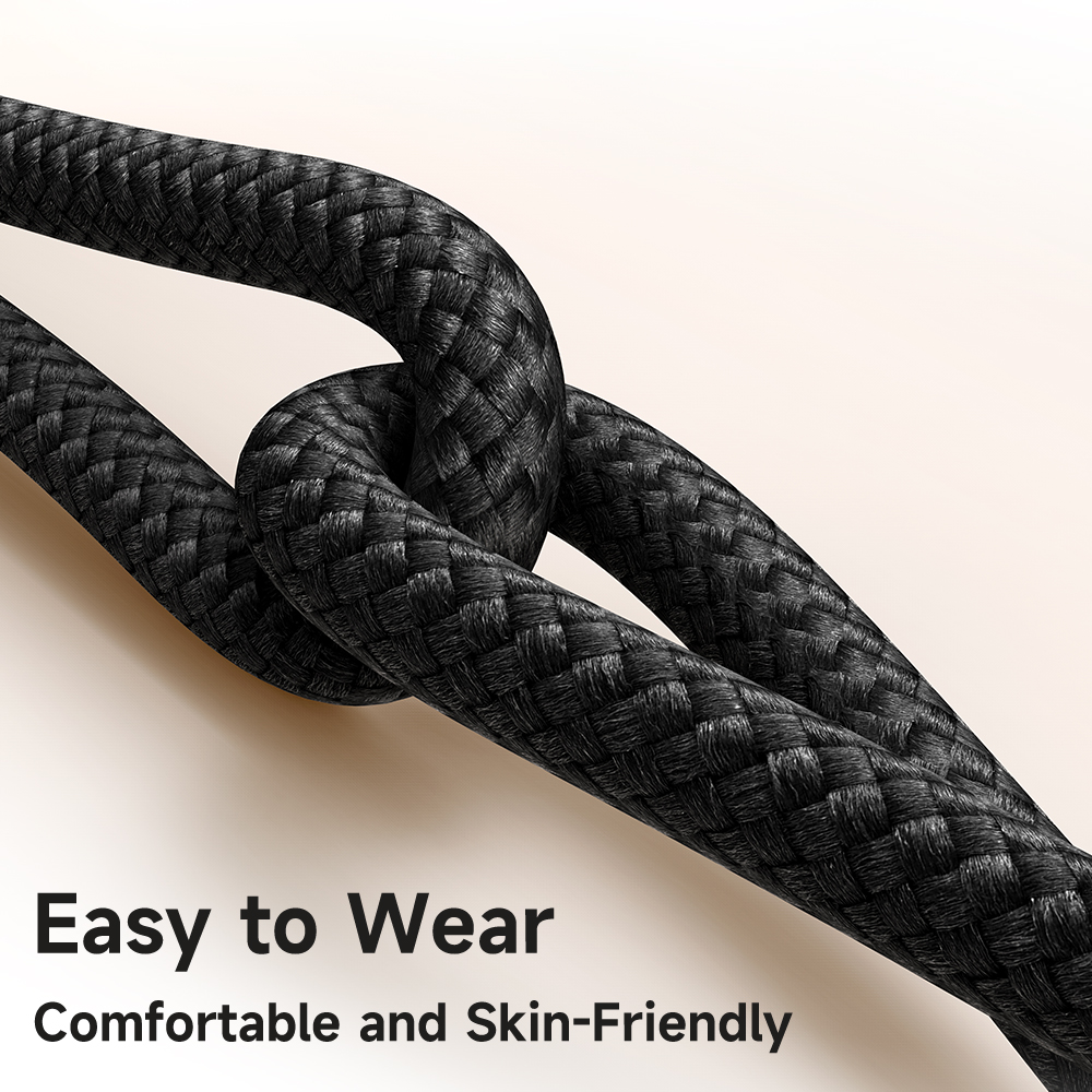 Das Kabel besteht aus widerstandsfähiger Zinklegierung und geflochtenem Nylon, was es besonders langlebig, flexibel und reißfest macht. Die verstellbare Hands-Free-Trageschlaufe sorgt für Komfort bei Reisen, Spaziergängen oder sportlichen Aktivitäten. Die durchdachte Konstruktion ermöglicht freie Nutzung des Ladeports – auch bei eingestecktem Kabel.