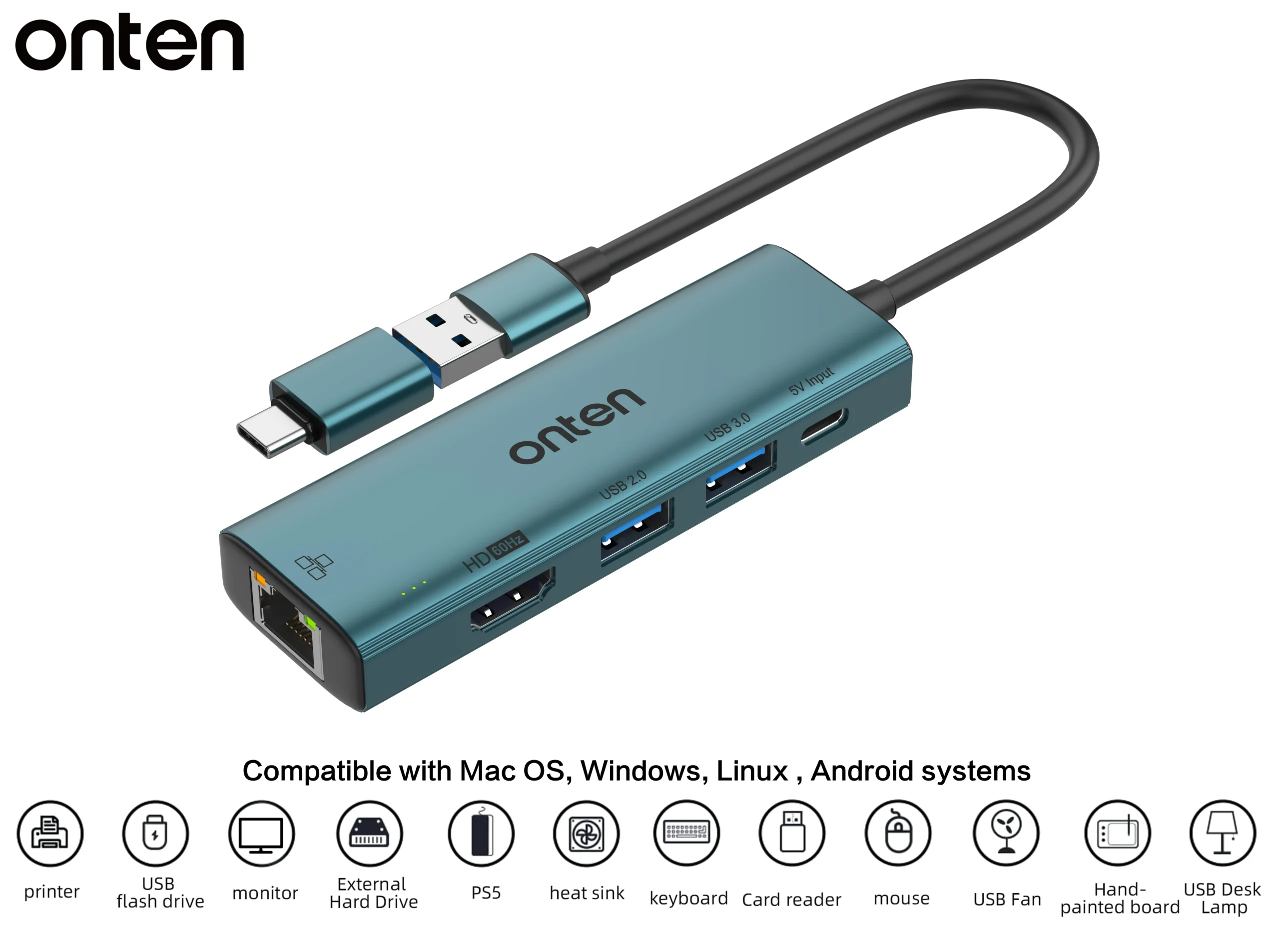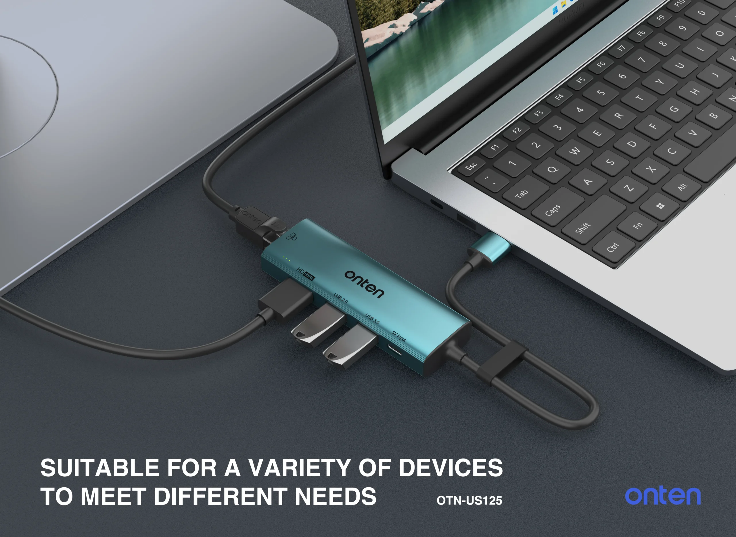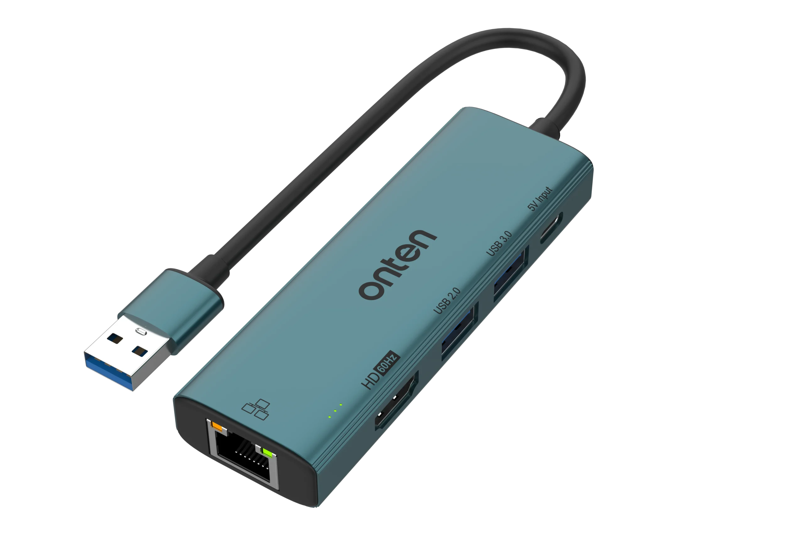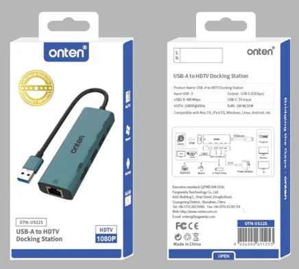 Der USB-3.0-zu-HDMI-Hub Onten OTN-US125 ist eine leistungsstarke Dockingstation für Benutzer, die ihre Anschlussmöglichkeiten erweitern möchten. Mit seinem stabilen Aluminiumgehäuse bietet er neben High-Speed-Datenübertragung über USB 3.0 und USB 2.0 auch eine HDMI-Ausgabe mit 1080p @ 60Hz.